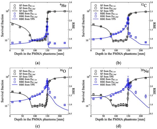 The black square markers in Figure 5 show the predicted SF for the HSGc-C5 cells, which were irradiated at various depth levels in PMMA phantoms across the SOBP of the ion beams. The SF values were calculated using the measured dose and y* presented in Figure 4. Apart from the plateau region and the distal part of the target region of 4He ions, the SFs predicted by the measured doses and the microdosimetric lineal energy spectra were consistent with the SFs predicted by the TPS. The averaged SFs over the SOBP region were 10.4 ± 1.4, 10.3 ± 1.4, 10.4 ± 0.8, and 10.5 ± 0.5% for the 4He-, 12C-, 16O-, and 20Ne-ion beams, respectively. The blue markers in Figure 5 indicate the predicted RBE at the same depth levels of the SOBP. The RBEs estimated at the middle of the target region (at 120 mm) were 0.98, 1.39, 1.58, and 1.71 for these ion beams, respectively. Except for the tail regions, the RBEs were very well aligned with the values planned by the TPS. Figure 6 shows the RBE-weighted dose planned by the TPS and the predicted biological dose from the measurements utilizing the SOI MicroPlus-mushroom microdosimeter toward these ion beams. Apart from the beginning distal part of the 4He-ion beam, the differences among the planned and the predicted biological doses were less than 3% across the target region. For the helium ion in Figure 6a, the biological dose is lower or close to the physical dose at a depth in a phantom almost until the middle of the SOBP, and this can be explained by Figure 2a, by comparing the SFs of helium ions and those of 200-kVp-X-ray beams, where helium ions with an LET of 4.5 keV/μm showed a higher SF than the X-rays.