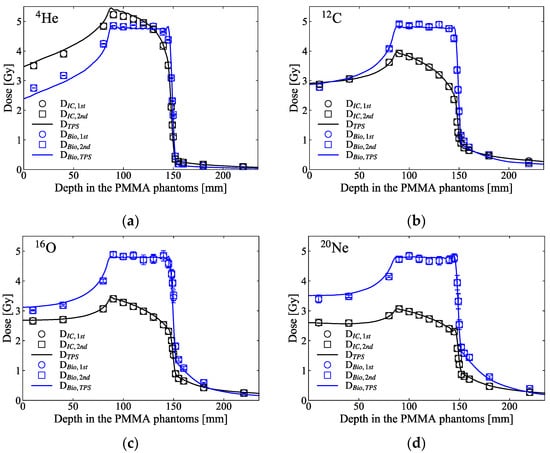 The blue markers show the biological dose along the SOBP of (a) 4He-, (b) 12C-, (c) 16O-, and (d) 20Ne-ion beams, calculated by means of multiplication of the physical doses and the RBE presented in Figure 5. The black square markers are the measured dose  presented in Figure 4. The black and blue solid lines indicate the planned physical and biological doses calculated by the TPS. Each error bar corresponds to the uncertainties of the biological dose evaluated from the error of lineal energy using error propagation.