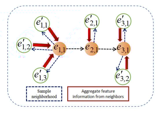 The GraphSAGE algorithm was proposed by Hamilton et al. [29] in 2017 to perceive the characteristics of a graph structure, and it has very good adaptability to dynamic graph structures. Unlike the GCN [30], which requires a specific calculation structure, GraphSAGE applies a calculation strategy. The algorithm assumes that the characteristics of a node are determined by the surrounding nodes, and the final node characteristics can be obtained after multiple rounds of sampling and aggregation. Furthermore, the feature aggregation operation is defined as a recursive process that first diffuses sampling from the central node layer by layer and then aggregates layer by layer from the outermost layer. This method can solve the problem of insufficient GCN flexibility. The sampling process starts from the final node, spreads out along the adjacent nodes layer by layer, and sequentially adds nodes that require final aggregation features. When selecting neighbors, a fixed number can be randomly selected, or the types of edges and adjacent nodes can be screened, which has a very high degree of freedom. When all nodes are sampled, the features are aggregated layer by layer from the outermost layer. Through the aggregation process, the output feature of the adjacent nodes includes the topological features of the subgraph in which they are located, and the features of the final node also include the topological features of the subgraph within two hops.