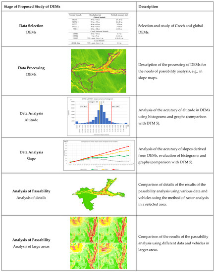 Terrain passability analysis as an integral part of battlefield intelligence plays a key role in military operations. Digital elevation models (DEMs) are the most detailed and up-to-date source of landscape information in comparison with other types of data (soil, forests, roads, settlements, etc.). The terrain relief is also the most stable part of the landscape. From the military perspective, DEMs are one of the only reliable sources of information for detailed, accurate and rapid terrain analyses. On the other hand, the quality of elevation models varies substantially depending on an area of the world. North Atlantic Treaty Organization (NATO) nations’ territory is covered with data with a high resolution and accuracy. The availability of high-quality data beyond European territory might be very limited (e.g., processed ready-to-use 1 m terrain models). Therefore, any output analysis from the data is constrained as well. It is essential to know what effect the detail of individual terrain models and slope models derived from them has on the results of terrain passability analyses. Besides the military perspective, there are other domains that have analysed DEMs for the extraction of landscape information. Study [1] referred to the impact on the protection of water resources, and photogrammetry-based mapping of microrelief forms was studied in [2,3], which used tri-stereo Pleiades images for the morphometric measurement.