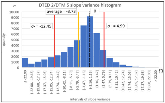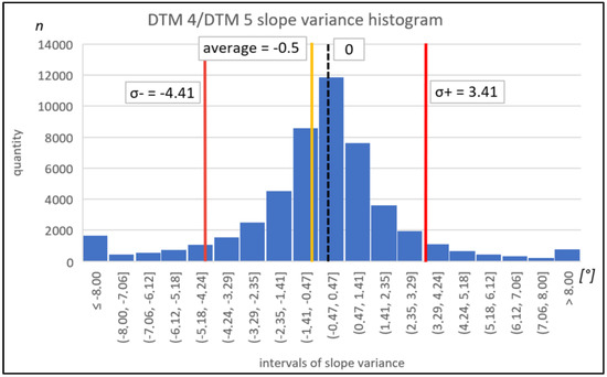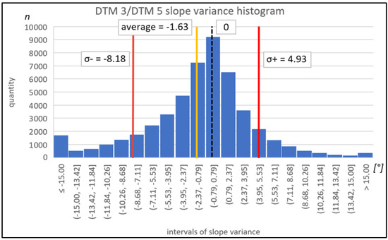 Figure 2, Figure 3 and Figure 4 show histograms of all values of the standard deviations of slopes without division into classes, unlike in Table 3, where the values were divided into slope classes. The goal was to verify the trends in the accuracy of the data with two different methods. The histograms showed a deviation of the average value from the zero value for all elevation models, and at the same time, the range of standard deviations was compared. The lower the detail of the model, the higher the variance.
