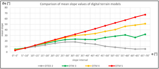 Graph comparing mean slope values of different terrain models (DTM 5, DTM 4, DTM 3, DTED 2) at identical points. Slope classes were determined from DTM 5.