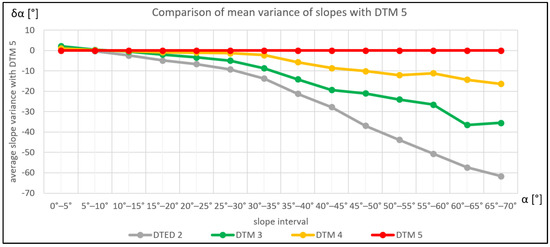 Graph comparing the mean variance of slopes of different terrain models (DTM 5, DTM 4, DTM 3, DTED 2) at identical points. Slope classes were determined from DTM 5.