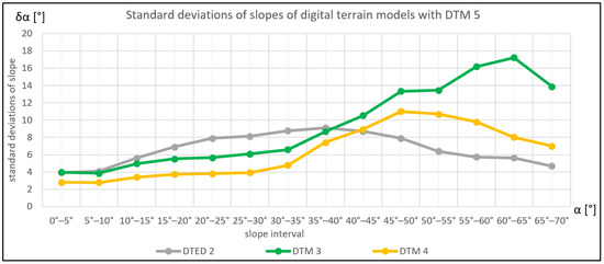 Graph comparing standard deviations of slopes of different terrain models (DTM 5, DTM 4, DTM 3, DTED 2) at identical points. Slope classes were determined from DTM 5.