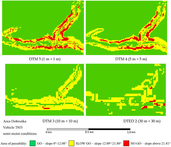 Properties of digital terrain models can also be studied from the view of their use in the decision-making processes of commanders and staff. Data properties are evaluated from the area difference in the calculated passability. A difference was given by comparing selected models with the most detailed data (e.g., the difference between DTM 3 and DTM 5). Each pixel was assigned one of three passability values (GO, SLOW GO, NO GO) according to the parameters calculated from the traction curves of selected vehicles. For the calculation of the parameters, see [16]. This was based on the findings of the evaluation of dynamics of vehicle movement in the terrain of [46,47]. A total area of all pixels was then converted to percentages of passable, hardly passable, and impassable terrain. Map comparisons of the results of CCM analysis for the T815 vehicle and all tested terrain models are shown in Figure 8. A summary of passable area deviations between lower detail models and DTM 5 is displayed in Table 4.
