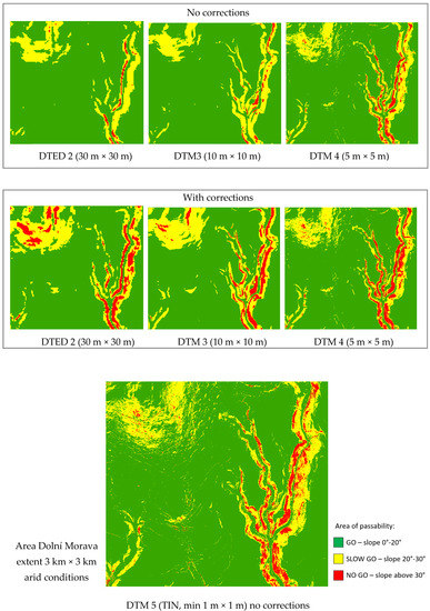 On the right side of the map (Figure 9) is a valley that represents an impassable obstacle. Without corrections, the valley was evaluated as hardly passable when using DTM 3 and DTED 2. With implemented corrections, the valley was correctly displayed as impassable also in these lower detail models. Furthermore, shapes of other major terrain features representing hardly passable terrain were displayed more accurately (e.g., a small valley in the lower-left corner of the map). The detail of DTM 5 allowed for displaying a fragmented terrain (e.g., top left corner).