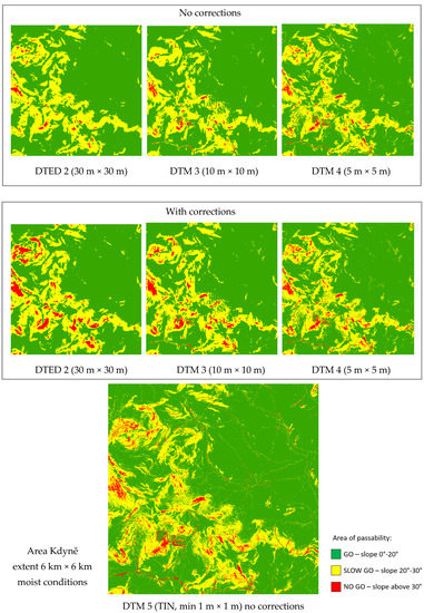 The accuracy of the selected method of slope corrections could be observed from an extent of impassable terrain calculated from the selected elevation models. The impassable area was significantly more accurate with implemented slope corrections. More important is the fact that these slope adjustments allowed for distinguishing hardly passable and impassable terrain with noticeably higher precision.
