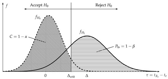 In order to calculate the confidence level, C, as well as the , the distributions of the test statistic under validity of the null and the alternative hypothesis must be obtained. Using the safety distance from (3) as well as the effect size from (4), the test statistic, , of reliability demonstration tests is defined as