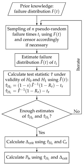 Several scientific domains other than reliability engineering have used power analysis for years. Here, the focus often is on the evaluation of statistically significant effects in relation to the sample size and the determination of rules for termination in the event of a low probability of success in a study (see, e.g., [3,4,5,6]). In quality engineering, statistical power analysis is used in order to efficiently deal with lot acceptance tests and production parameter assessment [7]. In the reliability domain and within the scope of life testing of technical products, a holistic approach for power analyses has not been established for successful demonstration of reliability targets considering all possible test types. The uncertainty of the tested sample is assessed primarily by means of the confidence level, which solely addresses the type I statistical error [8]. Several tested samples of the same size result in different confidence intervals due to sampling variability [9]. Therefore, it is not sufficient to calculate the sample size required to demonstrate the reliability target solely by means of the confidence level; e.g., see [8]. A simple transfer of these power analyses to the life testing framework is challenging, as state-of-the-art analytic power analyses are only permissible for normally distributed residuals [1]. This does not apply to life data, which are usually Weibull or log-normally distributed [9]. Further challenges in life testing are the various test types and configurations, such as time- or failure-censored tests with or without load acceleration. For accelerated life tests, a life-stress model must be determined to demonstrate reliability for field load. It is possible to carry out life tests at different system levels, as well, such as at the component or subsystem level, which brings additional challenges. These aspects must be considered for the application of power analyses when planning reliability tests. The metric for the assessment of the accuracy must contain information as to whether a life test is capable of demonstrating a required reliability with required lifetime and confidence level . Due to the randomness of the process and the sole frequentist nature of reliability targets, it is necessary to deal with probabilities, and statistical power (as a statistical variable) must therefore be transferred to the domain of reliability test planning in order to be interpreted as the probability of a successful reliability test. The challenges are the generalization of the target variable in order for different test strategies to be dealt with and compared to each other, and performing the calculation in an efficient way.