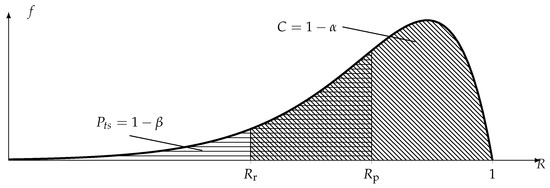 where is the Euler beta function [55] and the resulting beta distributions both have the parameters and , as the resulting confidence distribution of the SR test is determined only by the number of surviving and the number of failing specimens k. Because it is the same distribution, it is immediately apparent that is the complement of the confidence as the product’s reliability approaches the required level ( as or ). When planning the SR test, (15) is used to calculate the required sample size to meet the reliability requirement; hence, the sample size and the resulting distribution of reliability (beta distribution in (17) and (18)) are fixed by design. Because of this, the SR test can only achieve acceptable values for (e.g., ) if the product is over-sized to a great extent in terms of its reliability performance. The relevant distributions (see (17) and (18)) and parameters are shown in Figure 3.