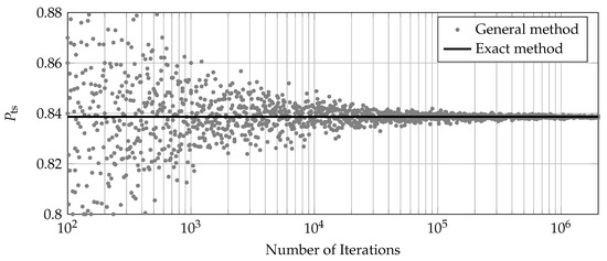 The MCS of the general method converges to the exact method; 100,000 iterations ensures reasonable accuracy in this scenario with the prior knowledge as Weibull-distributed failures, with and and no allowed failures for the lifetime requirement of (). When scenarios using different prior knowledge and different requirements are analyzed, and when failures are allowed, similar behavior is shown, leading to the conclusion that the exact method is to be preferred for calculating the of an SR test. In addition, the exact method is much more effortless to use, as no MCS iteration has to take place.