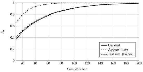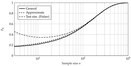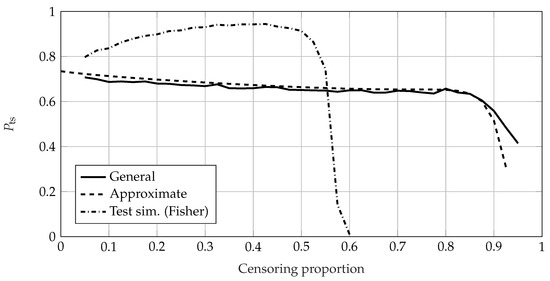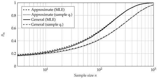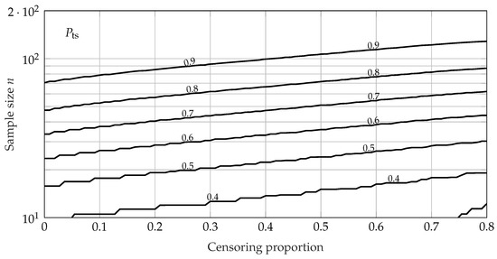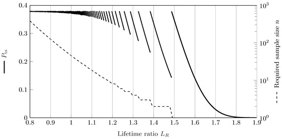The required sample size for SR tests using the lifetime ratio is calculated accordingly, using (19) and (20). It can be seen that the SR test using a lifetime ratio reaches its maximum value of at . The required sample size increases exponentially for decreasing values of and quickly drops to 1 for due to the large shape parameter of the Weibull distribution.