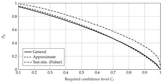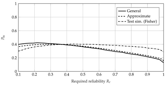 For calculating the of an SR test, the general method, the exact method, and the test simulation method can be used. Due to the lack of an MLE and confidence level estimation, the general calculation method coincides with the method of test simulation. As no MLE takes place during the SR test, no influence of an estimation method is expected and the general method converges to the exact method. This can be seen in Figure 4 for a requirement of .