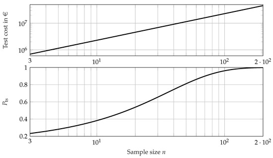In practical applications, success run tests (SR tests, called zero-failure tests or failure-free tests) are often used for reliability demonstration because the required sample size and reliability can easily be obtained using the binomial distribution [10]. Due to the equation only representing a significance test, only the confidence level C is considered. Over the past decades, there has been great effort to reduce the required sample size for the SR test by using Bayes’ rule [11], as its testing effort is quite high, especially for high reliability requirements, and even higher if failures occur during testing. Although the concept of a reliability demonstration has to be based on a frequentist view, due to the confidence level which is requirend and to be demonstrated Bayes’ rule continues to be used for aggregation of additional information. However, the demonstration is carried out solely using the frequentist confidence level instead of a credibility interval or other related concepts. Methods described by Beyer and Lauster [12,13], Guida and Pulcini [14], Kleyner et al. [15,16], Krolo [17,18,19], Savchuk and Martz [20], and Grundler et al. [21] use reliability information from similar products such as predecessors. The resulting posterior density can be used to carry out the reliability demonstration. For planning purposes, however, assuming a successful test (no failures occur), the posterior density can be used to calculate the required sample size for the test. These procedures differ partly in the determination of the prior distribution and in the proportion of prior knowledge used. Bayer and Lauster [12] do not use a distribution of reliability in their method, instead using a nominal reliability value with a fixed confidence level of 63.2% of the predecessor product. Grundler et al. [13] remove this restriction, permitting variable confidence levels as well as accelerated tests. When employing the Kleyner and Krolo methods [15,16], failure distributions can be used as prior knowledge. Kleyner et al. [15] use a beta and a uniform distribution, which are weighted according to the similarity of the products. The method introduced by Krolo [17,18,19] allows prior knowledge from different populations and sources, such as test results and field data, to be used. Additionally, Grundler’s approach [13] permits the use of prior knowledge from fatigue and lifetime calculations. The main challenge of these methods is the primarily subjective assessment of the similarity of two products, which makes the reliability demonstration vulnerable in the event of doubt [22]. Although Hitziger [23] describes approaches for determining similarity, uncertainty remains in the application of these methods, because even very small changes in the production process can lead to profound changes in failure behavior. However, it is difficult to objectively attest a certain similarity of the products in this case. None of the methods for reducing the required sample size of SR tests takes the type II error into account for test planning; in fact, only the type I error is considered by the confidence level. Consequently, no statement on the result of the test is possible, which means that no estimate can be made about either the success of the test nor about a successful reliability demonstration. However, some approaches do exist which address the issue of the two types of risks during zero-failure testing. Lu et al. [24] use the Bayesian approach presented in [25] in order to assign a success probability to the failure-free reliability demonstration test. However, they make use of an indifference region, which uses an interval of reliability values instead of a single reliability target. This results in a decoupling of the planning and assessment aspects of the test from the reliability target. The reliability target should be very much integrated as an integral part of reliability demonstration test planning. The very similar approach in [26] uses the assurance of [25] in order to calculate a probability for the outcome of the SR test. The main drawback, other than the use of two reliability values instead of one reliability target, is the sole focus on the SR test. No other test types can be analysed using these approaches and no comments about lifetime ratios or acceleration factors are made. A transfer to the context of failure-based tests is not trivial, as these approaches rely on the binary classification on which the SR test is based. Wilson and Farrow [27] propose a Monte Carlo simulation (MCS) for assurance calculation of failure-based tests. However, the computational burden is very high, and the indifference region is used. The problem with these Bayesian approaches of [24,25,26,27] is that they result in a credibility interval instead of a confidence interval, which is required for a reliability demonstration with a required confidence level. In addition, the indifference region does not comply with the demonstrated reliability target.