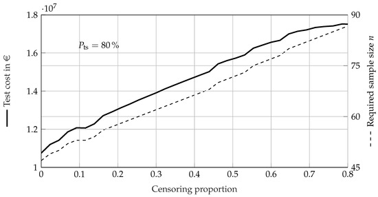 The censoring enables a maximum reduction in costs of about for a fixed sample size. However, stronger censoring results in lower values of , which in turn result in a higher required sample size, and thus higher test costs. The SR test without permitted failures and no lifetime ratio does need specimen to survive in order to demonstrate the requirement of Table 3 (using (15)). However, when using (16), the SR test only yields a value of ; therefore, it should not be used at all. The values of in an SR test using a lifetime ratio can be seen in Figure 17.