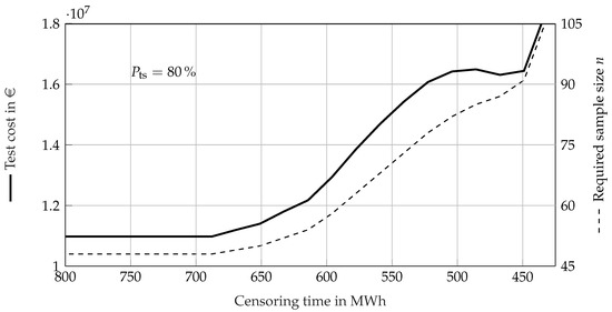 It can be seen that a sample size of has and costs EUR 10.98 million for the uncensored EoL test. Therefore, it is the most efficient test in terms of reliability demonstration. Alternatively, in order to use the whole budget, an EoL test using samples yields an even greater value of , while costing EUR 12.81 million. Due to the high value of the Weibull shape parameter of , the total test costs do not scatter to a great extent for the uncensored EoL test with a standard deviation of EUR 195,000 () and EUR 215,000 (). Here, the SR test is unsuitable due to a value of , however, it costs significantly less than the EoL tests, with a total test cost of EUR 7.29 million. Only through objective assessment using the can the risk of a failing test be acounted for in the decision-making process of reliability test planning. In of cases, the EUR 7.29 million of the SR test would not suffice for reliability demonstration, as failures would occur during testing.
