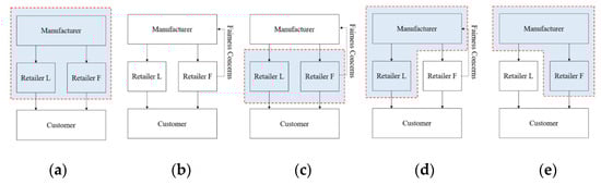 In this CLSC, consumers’ willingness to pay for a new product is assumed to be , which is a uniform distribution from 0 to 1. For a remanufactured product, consumers’ willingness to pay is a portion of with . The utility of a consumer receiving from Retailer L for a new product is , and the utility of a consumer receiving from Retailer L for a remanufactured product is . Following the principle of utility maximization, if , consumers will purchase a new product, leading to a new product demand function . If , consumers will purchase a remanufactured product, resulting in a remanufactured product demand function [,,]. Likewise, the utility of a consumer receiving from Retailer F for a new product is , and for a remanufactured product is . If , a new product demand function is . If , a remanufactured product demand function is .