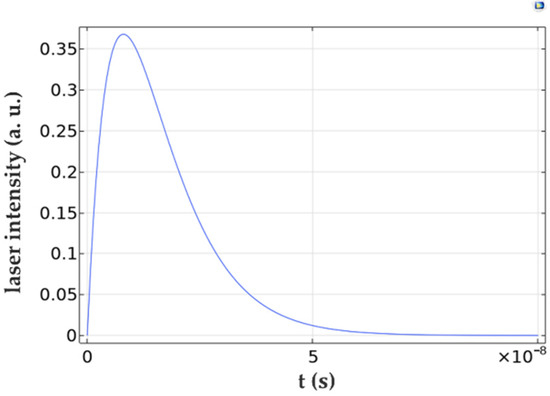 For simplicity, to show the results of photothermal and photoacoustic phenomena and their feasibility, a homogeneous, isotropic cylindrical silicon model with a height of 1 mm and a radius of 4 mm was constructed (model 1), as shown in Figure 1. A 266 nm pulsed light source was perpendicularly incident on the center of the top surface of the cylinder. A pulsed laser was used to generate ultrasound, which was modeled as a Gaussian beam in the form of f(t) = t/t0 e−t/t0 vs. time domain, where t0 represents the rise time of the pulse, and g(t) = at space with temporal incident intensity of 160 µJ with an absorption coefficient of 0.8, where r0 represents half-width at 1/e2 -intensity point. The time and space profiles of the laser pulse are shown in Figure 2 and Figure 3, respectively.