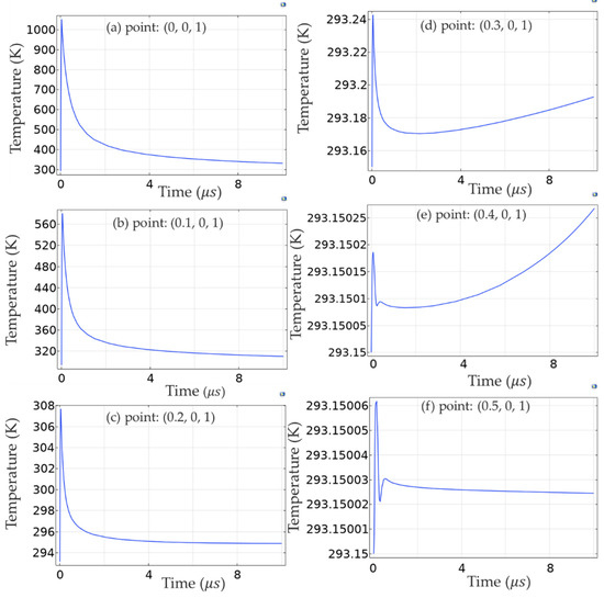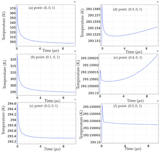 Since the spot size at the 1/e2 was 100 µm, as can be seen from Figure 4b, in the 1/e2 area of the laser spot range, the temperature changing trend at each point was similar to that of the center point (0, 0, 1 mm), while at the edge of the laser spot, the laser-induced heat was relatively low, so the temperature change range was small. Within the radius of 0.3 mm from the center point (0, 0, 1 mm), the overall trend of temperature change was usually unchanged, that is, the temperature reached the maximum value within a certain time delay when the laser pulse reached the maximum value in the time domain, and then slowly decayed. When it exceeded the area outside the laser spot range, the temperature change was relatively small, <1K, because the thermal effect propagation was relatively slow, as can be seen from Table 1; the thermal conductivity of silicon at 293 K was 1.38 W/( m ∙ K).