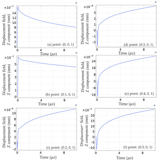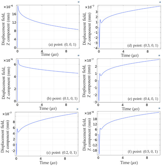 Therefore, it can be inferred from Figure 5c that, when the thermal effect propagated to these points, the thermally induced displacement far exceeded the displacement caused by photoacoustic pressure, within 1 µs vibrations, which was caused by the photoacoustic pressure occurring in the curves by first spreading to the negative direction of the Z-axis and then to the positive direction. However, after 1 µs, the displacement increased in the positive direction, because the thermal effect spread to this point, and the displacement disturbance caused by the thermal effect was greater than that caused by sound pressure, though the thermal diffusivity in silicon was 8.8 × 10−5 slower than the propagation speed of photoacoustic waves.