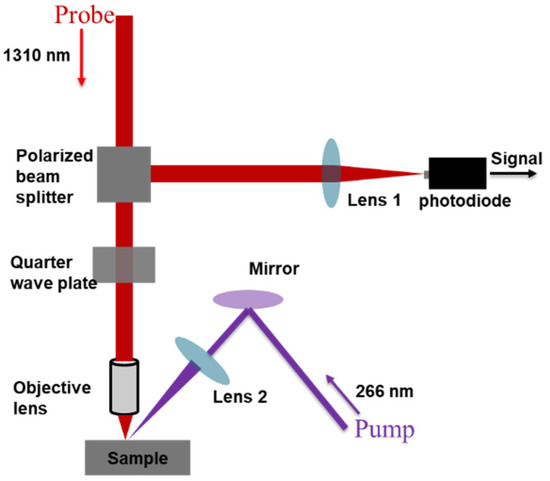 The schematic of the experimental setup is illustrated in Figure 8. A burst of nanosecond laser pulses was used to illuminate the phantom. A 1310 nm continuous-wave interrogation beam was focused on the phantom. The reflected interrogation content from the phantom was then collected. The exciting beam was focused onto the phantom, using a focusing mirror with a focal length of 100 mm. The probe beam was passed through a polarized beam splitter, followed by a λ/4 zero-order wave plate. Then, the probe beam was focused onto the phantom using a 0.4 NA objective lens. The back-reflected probe beam returned through the λ/4 zero-order wave plate and was redirected through the polarized beam splitter and focused onto the photodiode for detection. The excitation beam was 266 nm, with a 5 ns pulsed laser, and laterally exposed to the particles.