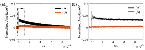 Temporal experimental time-domain results between agarose gel and silicon under different pulse laser intensities. The incident pulse energy in (B) was half that of (A); (b) the zoomed curve from (a), with a horizontal range of 100 µs.