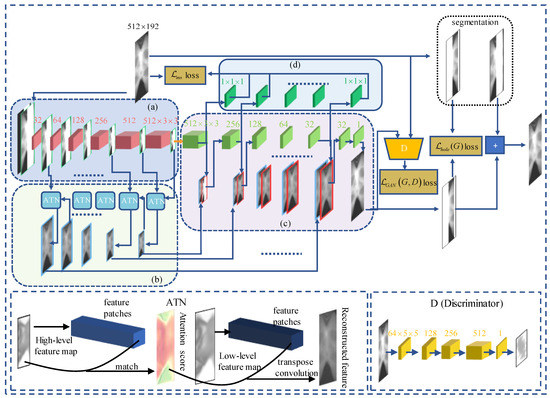 In order to overcome the limitation that encoder module (a) convolves layer by layer and cannot observe image features in the distance effectively, we added the attention module (b). By repeated use of attention network between adjacent layers of encoders and by learning the contents of the high-level semantic feature layer to fill the missing areas of the low-level feature layer, this cross-layer attention filling mechanism can achieve the mapping of high-level semantic features to low-level features, realize a higher resolution, and ensure the content consistency of the missing area. The method of this module drewn on the research of Yu et al. [26] and the implementation details are shown in Figure 2 ATN. By calculating the area matching degree between the () patch inside and outside the missing hole area, the external feature information is transferred to the inside of the area. The calculation of the matching degree is gauged by cosine similarity: