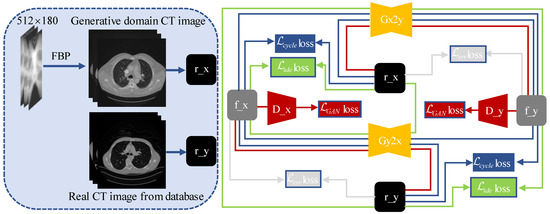 The AR-GAN is constructed on the basis of Cycle-Consistent Generative Adversarial Networks [27], and the generator and discriminator use the same network parameters as the original text. As shown in the AR-GAN framework diagram of Figure 3, the AR-GAN is composed of two generators and two discriminators. The generator maps the generation domain CT image to the domain through the loss of , , , and the loss constraint generated by the discriminator . The generator is similar.