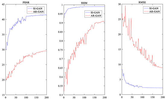 Averaged PSNR, SSIM, and RMSE Indicator values versus the number of epochs for SI-GAN and AR-GAN based on the projection data reconstruction training from lung data.