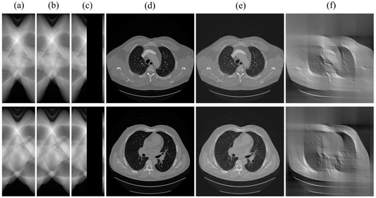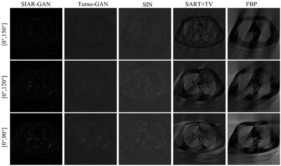 The absolute difference image can further compare the reconstruction results of each method. The results are shown in Figure 8. The smaller difference corresponds to a better reconstruction. The results of these three cases of projection angles all show that the reconstruction quality of the method in this paper works better. Comparing the reconstruction results of and , it can be found that the reconstruction quality degrades when less projection data are used.