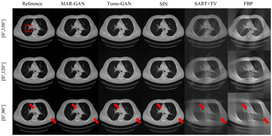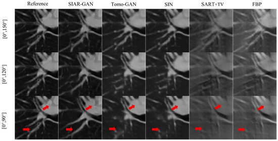 In order to compare the texture and structural details of the reconstruction results of each method more clearly, we selected the red framed area in Figure 7 to zoom in, as shown in Figure 9. Consistent with the results of the above analysis, the SART-TV and FBP methods exhibited a considerable number of artifacts and only the outline can be distinguished, while the textural details were completely blurred. In the area indicated by the red arrow in Figure 9, part of the structure and contours were not restored correctly, and the textural details were also lost when Tomo-GAN and SIN methods had only a limited angle of . In contrast, the SIAR-GAN method not only restored the complete structure, but also retained more textural details. Although there are still some imperfections compared with the reference image, SIAR-GAN produced high quality images that are superior to the other methods according to quantitative evaluation results by the RMSE, PSNR, and SSIM indicators.