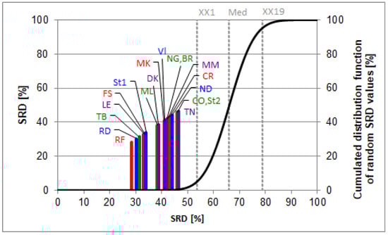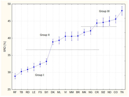 Figure 3 shows the characteristic grouping of experts. Post hoc tests suggest from six (Scheffé’s test) to nine (Tukey honestly significant difference test) overlapping groups, but three groups can be defined relatively easily (Figure 3): Group I (SRD < 35), Group II (37 < SRD < 43), and Group III (SRD > 43), I–group of recommendable experts, II–medium-moderate type experts, and III–not recommendable opinions.