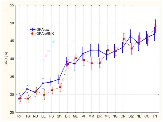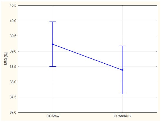 The next type of validation of the SRD values was by ANOVA with Factor 1: resampling variant (two levels: contiguous sevenfold resampling–A, random resampling with replacement–B), Factor 2: coding (two levels: (1) GPA coding, (2) partial reverse coding (full ranking): 14 categories from A− to F− are stretched from 1 to 32, and C), and Factor 3: experts (18 levels).