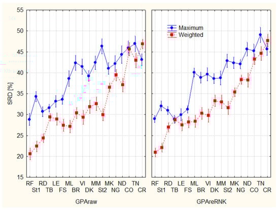 Splitting of experts according to ranking options (F1*F2); Sum of Ranking Differences, SRDs are scaled between 0 and 100. The error bars represent 95% confidence interval. F1: GPAraw–original GPA coding, GPAreRank (recoding to full rank), F2: Maximum, Weighted.