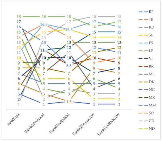 Comparison of TOPSIS, original and weighted SRD rankings along with the two coding schemes. rankTops—TOPSIS ranks, RankGPArawM—SRD ranks of original GPA coding with maximum reference, RankRevRNKM—SRD ranks of recoding to full rank with maximum reference, RankGPArawW—SRD ranks of original GPA coding with weighted reference, RankRevRNKW—SRD ranks of recoding to full rank with weighted reference.