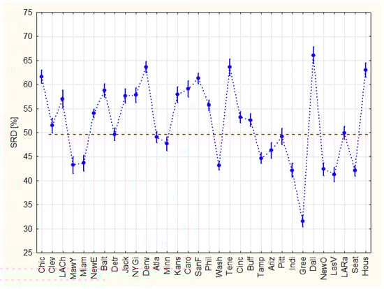 SRD ranks the teams based on the scores given by the experts, therefore each expert gets a vector of ranks from 1 to 32, as 32 teams are considered. In the second step, the so-called reference column, which is the consensus of all 18 experts, is also ranked from 1 to a maximum of 32 (one is the worst, two is the second worst, and so on, the largest is the best). The third step involves the computation of the row-wise rank differences between each expert and the reference column. The absolute rank differences are then summed up for each expert, creating the sum of ranking differences, a single demonstration of the distance between an expert and the consensus. If the SRD value of an expert equals zero, the expert ranked the teams exactly as the average of all experts’ scores (consensus). Median is also a viable option to define a consensus, it is warranted if outlying observations are suspected. Higher SRD values mean higher deviations from the consensus. Patterns of SRDs therefore might suggest characteristic groupings among the variables, e.g., variables closer to each other are more similar in terms of their distance from the reference. The algorithm for the sum of ranking differences was calculated with Microsoft Office Excel 2007 macro retrieved from: http://aki.ttk.hu/srd/ (accessed on 14 June 2022).