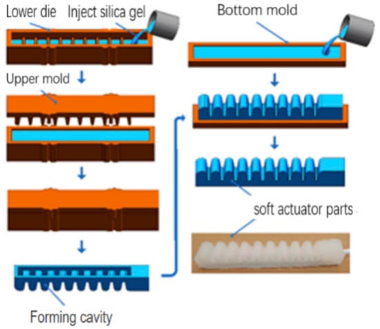- Actuator molding process: The mold of the soft actuator consists of the upper mold, the lower mold, the plug, and the bottom mold. The molds are designed by 3D software UG and 3D printing. The type of 3D printing equipment is model SP600 with a wavelength of 355 nm and accuracy of 0.1 mm. The printing material was 9400 resin, milky white, 320 cps (30°), density 1.14 g/cm, curing depth 0.12 mm (Dp). Since the upper and lower mold surfaces of the soft gripper are closely bonded during the assembly of the mold, the upper and lower mold surfaces are equipped with an exhaust groove to avoid bubbles affecting the quality of the molded products. For the sake of facilitating the connection with the air source, a 3 mm round hole is arranged at the end of the mold, and the inlet pipe connects the actuator and fixture through the round hole. The whole soft actuator is cast by the casting molding method with the main process flow shown in the diagram.