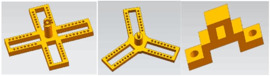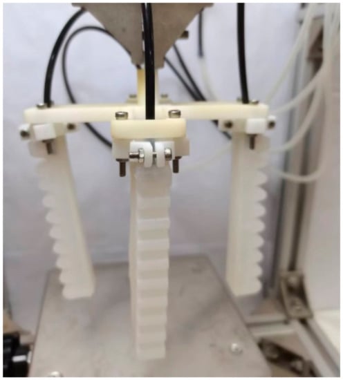 According to the principle of bionics and the structural analysis of the pneumatic multi-cavity soft gripper [24], the multi-cavity pneumatic soft gripper is mainly composed of a fixture, chuck, and soft actuator, which are connected to the end of the fixture by the connector in a symmetrical distribution. The angle between the three grippers of the three-gripper fixtures is 120° and that between the four grippers of the four-gripper fixtures is 90°. Besides, each bracket is 85 mm in length with seven slots. The fixture is designed with the software SolidWorks and 3D printing mold. The soft gripper can grab objects with different diameters by adjusting the clamping position on the fixture. Four-gripper and three-gripper fixtures as well as the chuck structure are shown in Figure 1.