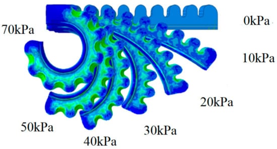 Under the action of the air pressure input on the actuator, the cavity of the excessive pressure actuator deformed to both sides of the drum with the increase in pressure, as shown in Figure 6.