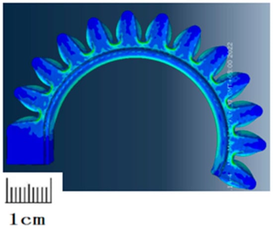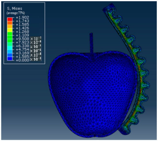 To compare and study the grasping reliability of soft fingers, the designed soft fingers were used to grasp apples with diameters of 45 mm. The grasping ability and reliability were analyzed by comparing the contact force and contact area between the fingers and the apples, as shown in Table 1. After modeling soft fingers and apples, finite element analysis was performed. The setting parameters were the internal pressure of the finger is 35 kPa, surface contact between soft gripper and apples, the contact attribute is that the tangential behavior is frictionless, the radial behavior is ‘hard’ contact, the contact surface is set to the lower surface of the finger and the outer surface of the apple, and the soft gripper grasps the arc object to select the apple. The simulation results are shown in Figure 13.