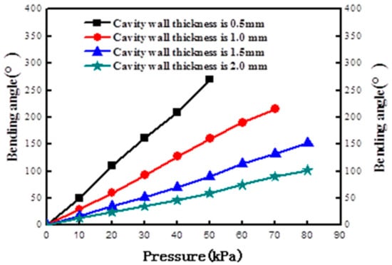 The influence of cavity wall thickness on the bending angle is shown in Figure 7. Besides, the relationship between the bending angle and air pressure of the air cavity wall was stimulated when the cavity wall thickness was 0.5 mm, 1 mm, 1.5 mm, and 2 mm, respectively. Through detailed analysis, it is found that the wall thickness exerted a great influence on the bending angle simulation, which was a key factor affecting the bending deformation performance of the actuator. When the thickness is 0.5 mm, the air pressure reaches about 30 kPa as the cavity wall thickness was thus too thin. Consequently, the bending angle would change quickly, and the simulation graphics show a red warning. When the thickness of the air cavity wall is 1.0 mm, the simulation results show that the bending angle of the actuator tends to be large, and the soft actuator bending is close to 150 degrees after compression reaches about 40 kPa. When the wall thickness is 1 mm and the air pressure is in the range of 0–30 kPa, the soft actuator is linearly related to the air pressure. When the air pressure is above 30 kPa, the air pressure of the soft finger is not linearly related to the bending angle of the finger, and overexpansion occurred. It shows that the expansion ratio of the bending layer is close to the elastic limit of the material. In the actual experiment when other parameters remain unchanged, the wall thickness continues to increase. When it is greater than 2 mm, the bending radius is less than 2 mm. If the wall thickness is 3.0 mm, the bending change of the actuator is very small when the air pressure is too low. Even if the pressure increases to about 90 kPa, the bending amplitude of the soft gripper cannot achieve good results in the actual grasping process; thus, it is not desirable. When the wall thickness is 2.0 mm, the bending angle is in line with that of the expected results as long as the experimental operation can be carried out in the corresponding pressure range. Through comprehensive analysis, 2 mm wall thickness was selected for the experiment under the condition that other parameters remained unchanged.