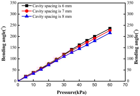 The length and width of the soft actuator are 85 mm and 10 mm, respectively, including nine cavities with the spacing between each cavity of 6 mm, 7 mm, and 8 mm, respectively. The wall thickness of the cavity is 2 mm, and the height of the cavity is 6 mm. The three kinds of cavity spacings were simulated by software, respectively, with the results shown in Figure 9. The graph shows that under the same pressure, the smaller cavity spacing contributes to stronger bending degree of the software actuator. Besides, when the cavity spacings are 6 mm and 7 mm, the bending effect is similar. With the decrease of cavity spacing, too small cavity spacing increases the difficulty of mold production and increases the difficulty and error of actual experimental operation. Therefore, it is necessary to use 6 mm spacing for the experiment.