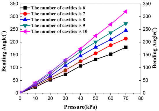 If the number of air cavities is too small, the pressure will be insufficient. Thus, this will lead to the small-driving force on the bottom of the soft gripper. Besides, increasing the pressure can increase the bending degree of the soft gripper, but excessive pressure will damage the air cavity, and the air tightness of the soft gripper will also be affected. An excessive number of gas cavities will make the structure complex and redundant. Therefore, the length of a soft gripper and the distance between cavities were first determined, and then soft grippers with six cavities, seven cavities, eight cavities, nine cavities, and ten cavities were selected for simulation analysis. The five kinds of cavity numbers were simulated by software, respectively, with the results shown in Figure 10. The bending degree of the six-cavity soft gripper is poor, while that of the other four are not significantly different under the same air pressure. However, the simulation is an analysis in an ideal state. In the actual experimental operation, if seven cavities are selected, the sealing of the soft gripper will be broken when the air pressure reaches 50 kPa. If 10 mm cavities are selected, the weight of the soft gripper will increase. Therefore, through comprehensive analysis and comparison, the nine-cavity soft gripper was finally used in the experiment.