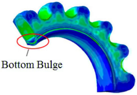 To achieve a better grasp of objects by the soft gripper, the bottom thickness of the soft gripper is 1.5 mm, 2 mm, 3 mm, and 4 mm, respectively, and the thickness of the nylon cloth of the limiting layer is 0.5 mm. When the thickness of the lower wall is 1.0 mm, there will appear a protrusion at the bottom of the soft actuator with the simulation results shown in Figure 11.