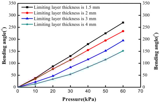 The simulation results of the bottom thickness and bending angle of the soft actuator are shown in Figure 12. The simulation figure shows that the bending angle of the soft actuator is basically linear with the change of pressure. The larger the thickness is, the smaller the bending curvature radius of the soft actuator will be. It is more difficult to operate the experiment with too thick of a confined layer; thus, 2 mm limiting layer thickness was chosen in the experiment.