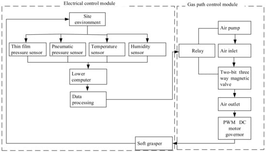 - The structure of the soft gripper is optimized, and the control and monitoring of the soft gripper are realized through the electrical control module, air circuit control module, and the sensor group module. Among them, the electrical control module controls the release and retention of pressure in the gas path and realizes data display, instruction sending, early warning prompt, and emergency stop button through the man–machine interface. In the multi-sensor module, the pressure sensor measures the input gas pressure. The film pressure sensor measures the pressure on the soft gripper. The temperature and humidity sensors measure the temperature and humidity of the environment. The gas path module is mainly used to control the gas pressure and velocity of the soft gripper in which the size of the airflow velocity can be controlled by PWM DC speed regulation. In addition, the control system designed by multi-module avoids the limitation of single control and guarantees stable grasping of the soft gripper.