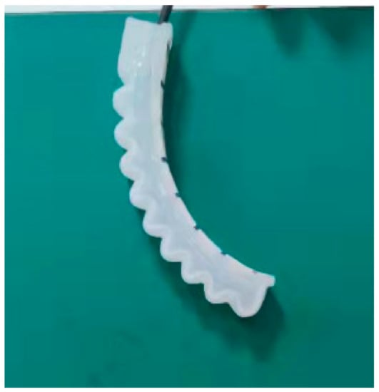 - Preparation of the sealing layer: The prepared mixed colloid was injected into the bottom mold to make it evenly spread. On top of it, the nylon cloth limiting layer with a certain size was placed horizontally and smoothly. Besides, a layer of colloid was evenly coated on the nylon cloth. Finally, the actuator cavity was buckled on it. After being kept at room temperature for 4 h, the molds were removed after complete curing. The soft gripper actuator part was thus finished. Pruning molding actuators are mostly silicone rubber, and the actuators that are damaged or bubbled as unqualified parts were discarded.