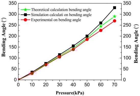 The relationship between the bending angle of the flexible actuator and the pressure can be obtained by substituting the actuator parameters in Table 1 into Equation (6). As we can see in Figure 17, the experimental data are lower than the theoretical and simulated data because the simulated data is in an ideal state, the calculation a result of the theoretical data related to models and assumptions, but the experimental data are related to the environment, the performance of the silicone rubber, the force of the gripper, and the curing effect. Therefore, there is a certain gap between the theoretical data and the simulation data. However, this is within permissible error. As a result, the theoretical data in the graphic display approach the simulation data, and the experimental data is smaller.