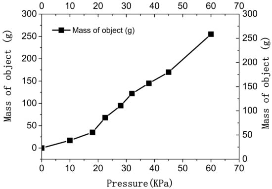 In the test, the weight of the test object was simulated by adding 5 g, 2 g, and 1 g weights in a disposable cup. The upper limit of weight that the gripper can grasp at different pressures was tested within the pressure range that the actuator can withstand. In terms of grasping load capacity, the experiment showed that the soft gripper had a certain carrying capacity with the maximum grasping weight of 107 g (Figure 18 and Figure 19).