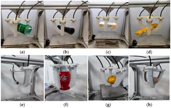The schematic of soft gripper grasping different object (a) mineral water bottle; (b) remote controller; (c) napkin paper; (d) Bar bread; (e) needle tube; (f) cola-bottle; (g) oriange; (h) egg.